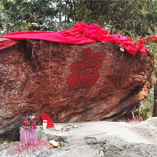 尽管凤山坐落在县城中心,但原来却很荒凉,上山的小道崎岖艰难。1986年,县委、县政府为丰富人民群众的文化娱乐生活,投资把凤山开辟为公园,发动群众修建了登上山顶的盘山道,从此游人便能轻松自如地登上山顶揽“福”了。清晨,我们沿着山道石阶,拾级而上,一路晨风习习,鸟语花香,清新的空气,让你忍不住深深地吸几口,再“啊、啊”地大喊几声,享受一种山林的野趣。登上山顶,果然见一块扇型石壁上,一个约三尺见方的“福”字,赫然在目。走近细细观赏,只见一笔一画,刚劲有力,真是一幅难得的书法珍品。可是令人费解的是,这幅石刻珍品上无题记,下无落款,谁人所书,何时所书,无从考证,传说是南宋时永福出的武状元李珙用手掌所书,距今已有890多年了。我们试着用手掌描摹了一遍,果然笔画间手指痕迹清晰可见,直像那么一回事。山顶地势平缓,林木扶疏,有不少退休的老人在打拳,做操,练气功,精致的鸟笼就挂在旁边的树上。山上,“冰凤阁”、“状元岩”、“倚云亭”遗迹尚存。“状元岩”又名“夫子岩”,有明永福州牧庞尚龙石刻诗《题夫子岩》:石室天开半月形,空中应隐列仙灵。廿年洗甲添新迹,此日摩岩识旧铭。奎聚五星开泰运,山巢双凤报佳音。若非贤尹崇先哲,千载何人识此心。庞尚龙生平不详,但他留下的这首诗,却给后人很多的启迪。“百寿图”出自永福县百寿镇的“寿字岩”。百寿镇古称永宁州,至今保存有历经500多年风雨仍完整无损的古代石城——永宁州城。这里山清水秀,田园风光秀美,一入斯境,恍若进人世外桃源。前人有诗赞道:可恨天公诚不平,倾将膏腴泽永宁。水旱无忧三千垌,十里多逢百岁人。在古城的东面,莽莽群山如奔腾的巨龙,直扑古城而来,逶迤至江滨公路却嗄然而止。领头的山冈,当地人取名为对河山,意指在古城的对岸。对河山不很高,然气势雄伟,怪石嶙峋,崐岩险峻,峭壁峥嵘。山上林木葱郁,古藤盘虬,生气盎然。在这苍翠如画的山冈西北面,葛藤如幔,石洞天开——这便是“寿字岩”了。—,从公路边下车观赏“寿字岩”,进山门,拾级而上,但见丹桂迎宾,黛竹含情,鸟语花香,沁人心脾。百步将及,转眼便到了灵岩幽境。但见岩高三丈余,宽达五丈多,深有四丈许。洞里幽敞绝尘,炎夏无暑,苔芜清润,钟乳琳琅,每当游人至此,倍感心旷神怡。