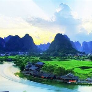 其实,陶渊明所作的《桃花源记》,是读了前人的《武陵记》后,再加上自身的游历和体验,半虚半实地创作出来的。在神奇美丽的神州大地,类似桃花源的地方很多,在以山水风光秀甲天下的阳朔县境内,就有这么一处“世外桃源”。晚唐诗人沈彬在任阳朔县令时,就写了一首诗:“陶潜彭泽五株柳,潘岳河阳一县花。两处怎如阳朔好,碧莲峰里住人家。”诗中指出阳朔的山水风光世所罕见。早在两千多年前,阳朔“世外桃源”的所在地,曾是汉代以来的古驿道地区,中原文化不断传入,至今仍有不少汉墓群遗址。笔架山、燕子岩一带周边十余里范围内,村民们均有种植桃树的习惯。每年三月,桃花怒放,状如红霞,加上金黄色的油茶花,雪白的茹菜花,再镶以紫红色的红花草,一眼望去,简直就是一个五彩斑斓的锦绣世界。沿着乌龟河两岸和燕子湖周边,数以十万计的各色桃花染红了青山脚下,村边路旁。沿途的田园村舍、古桥溪河、深潭溶洞,加上在田野上耕作的村民,构成一幅理想中的世外桃源景象。